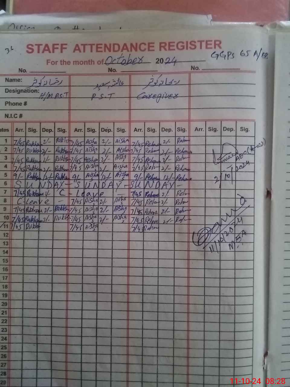 | CNIC | Full Name | Designation | R/C | Absence During Last Calender Month |