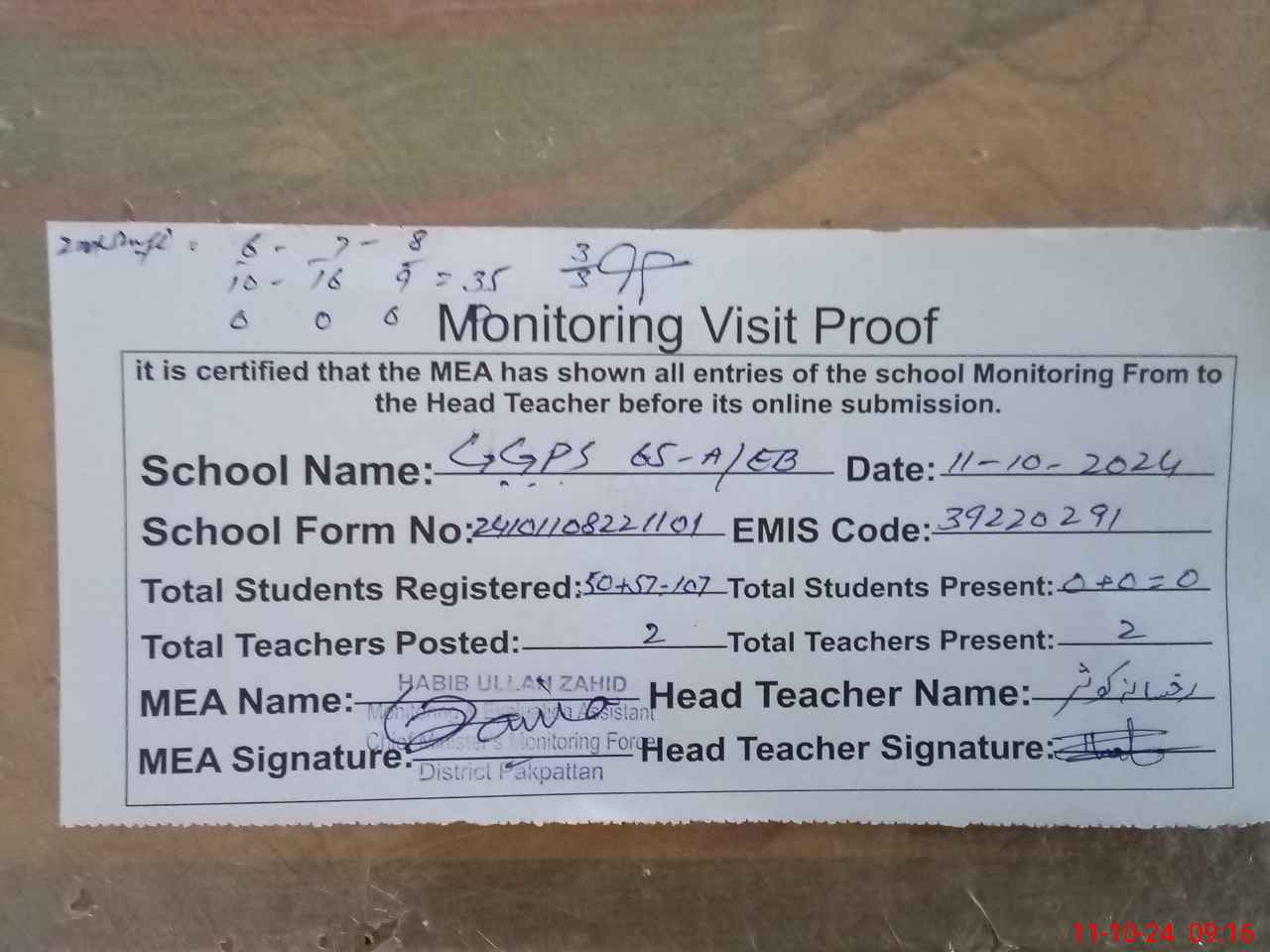 | Certified that this School was Inspected by the Undersigned MEA/DMO Today and the Information Stated Above is as Per Record. | |||||
