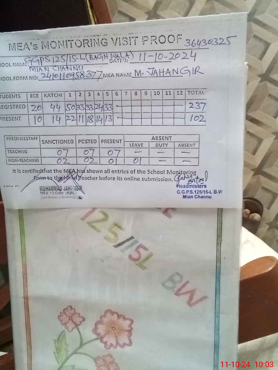 | EMIS Code: 36430325 | Name of School: GGPS 125/15-L BAGH WALA, MIAN CHANNU | |||