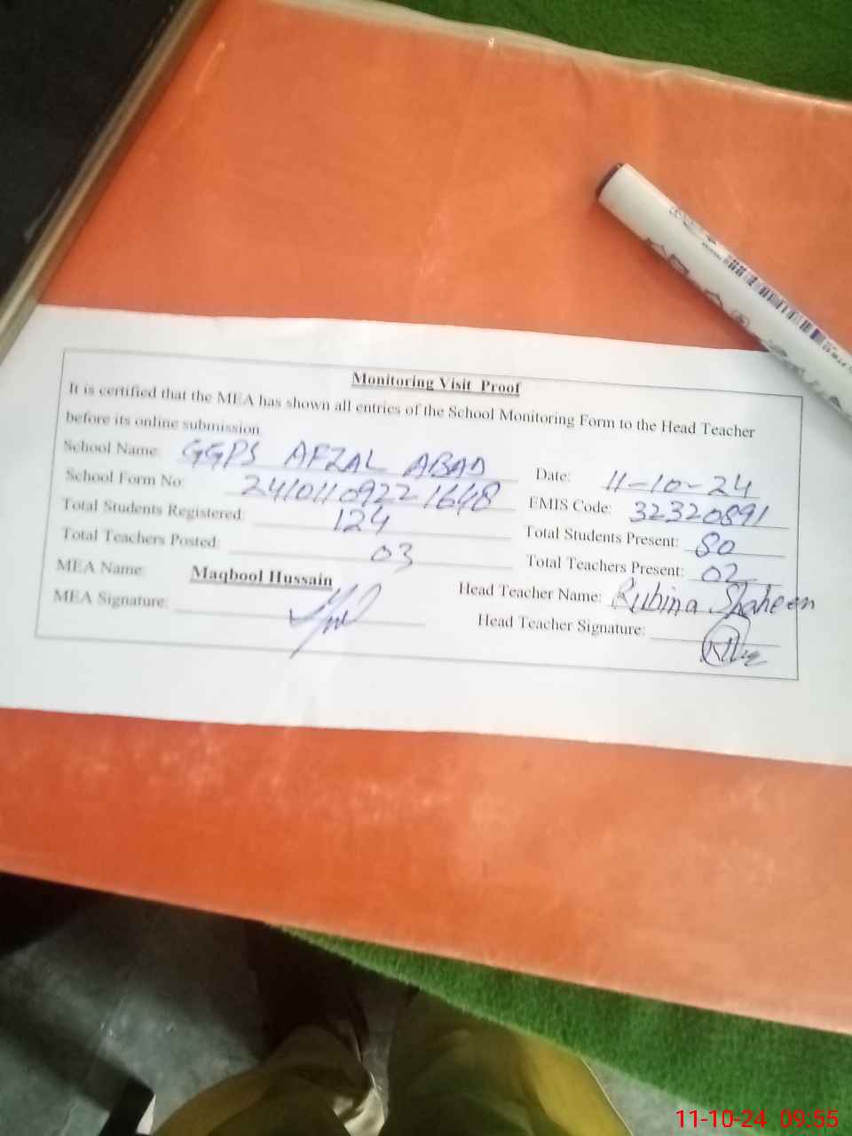 | Attendance Register | Head Teacher | MEA with School | Visit Proof |
