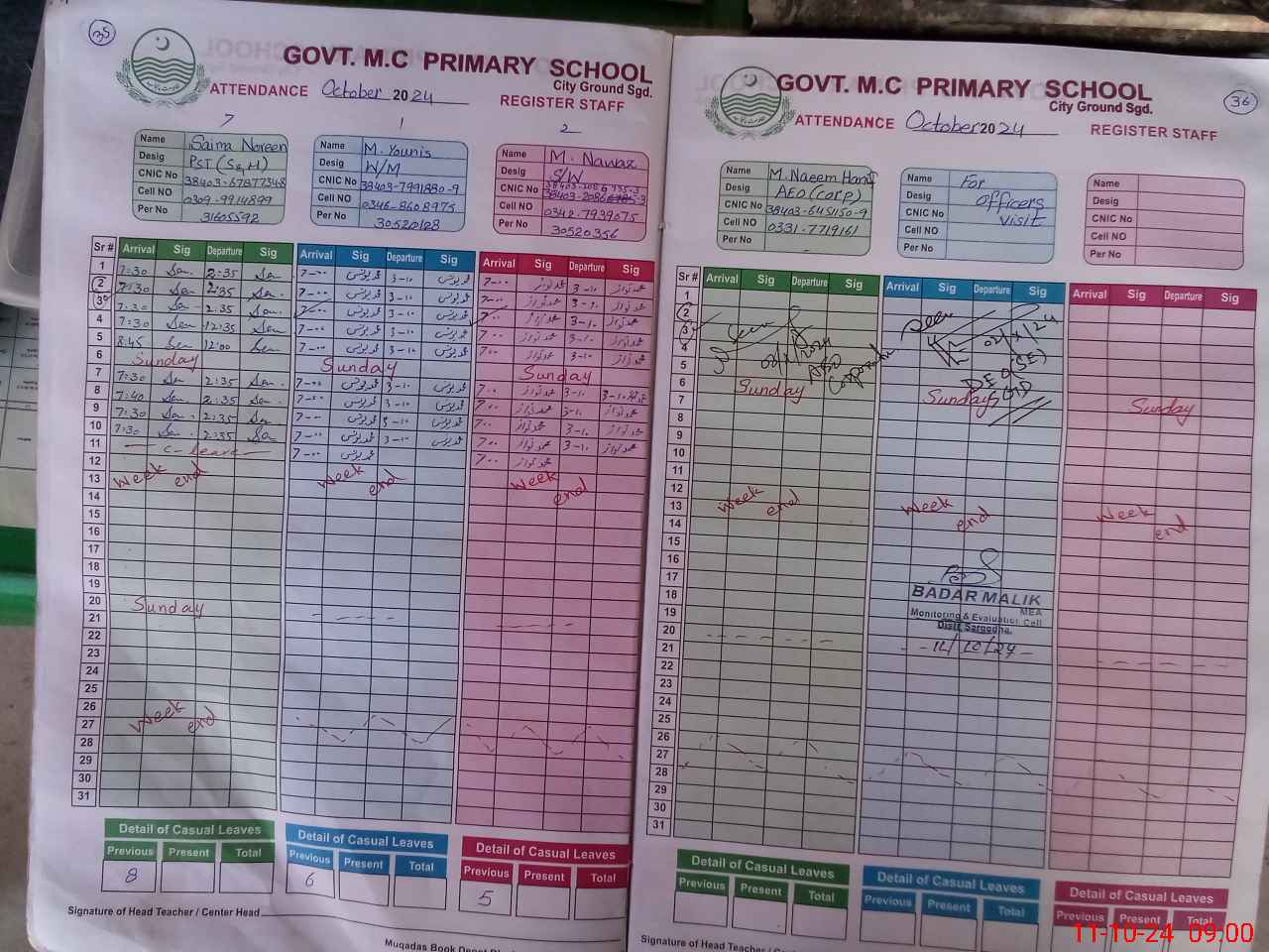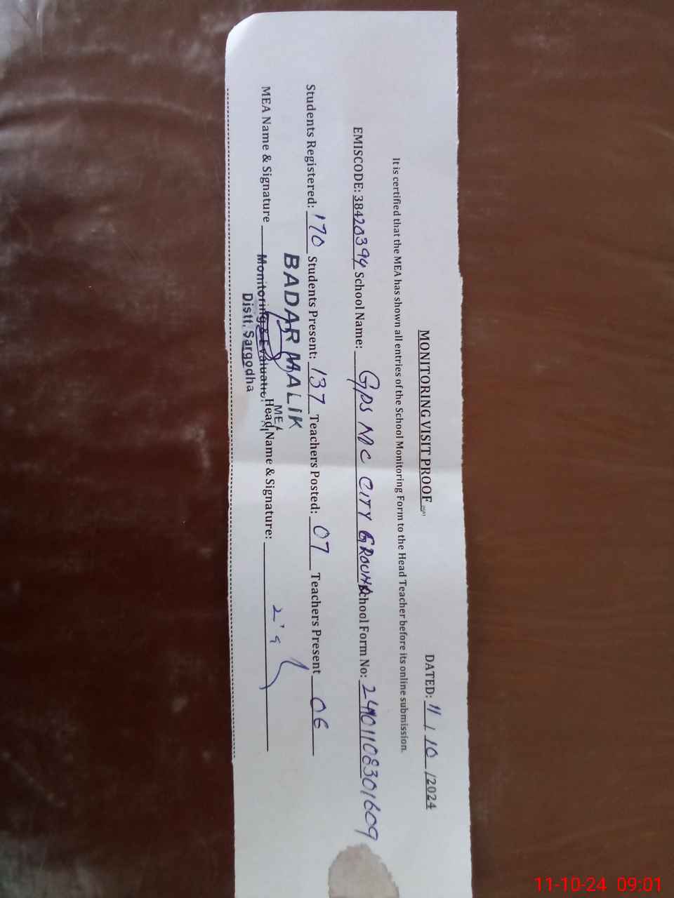 | Monitoring Date: 11-10-2024 | Start Time: 11-10-2024 08:30 AM | End Time: 11-10-2024 09:01 AM | Name of MEA: BA**** MU**** | |