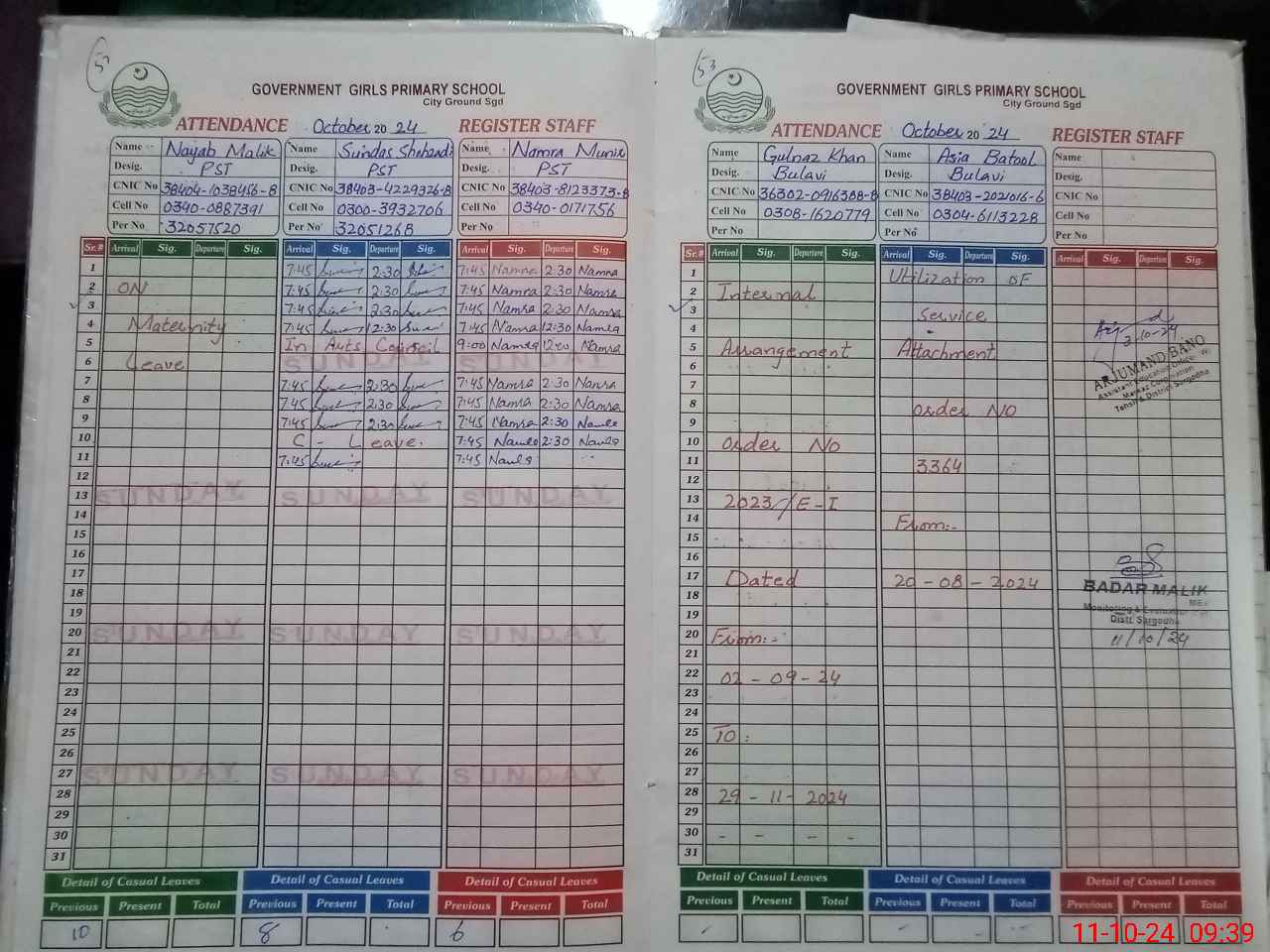 | CNIC | Full Name | Designation | R/C | Absence During Last Calender Month |