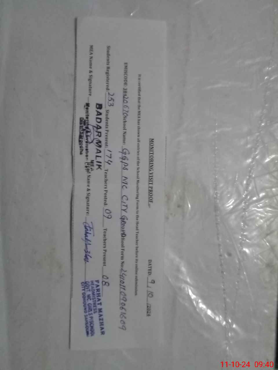 | Certified that this School was Inspected by the Undersigned MEA/DMO Today and the Information Stated Above is as Per Record. | |||||
