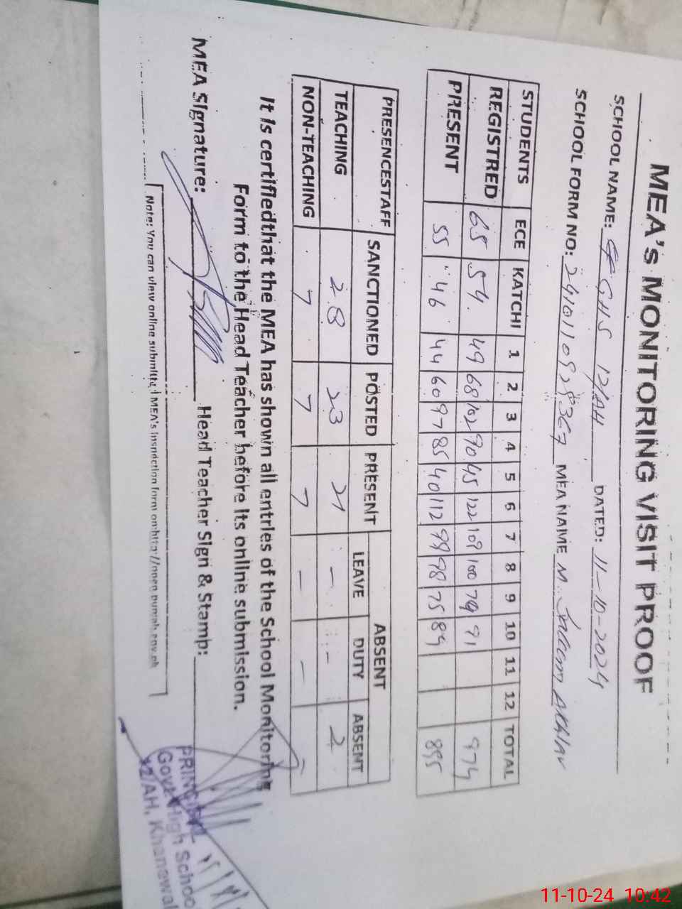 | Attendance Register | Head Teacher | MEA with School | Visit Proof |