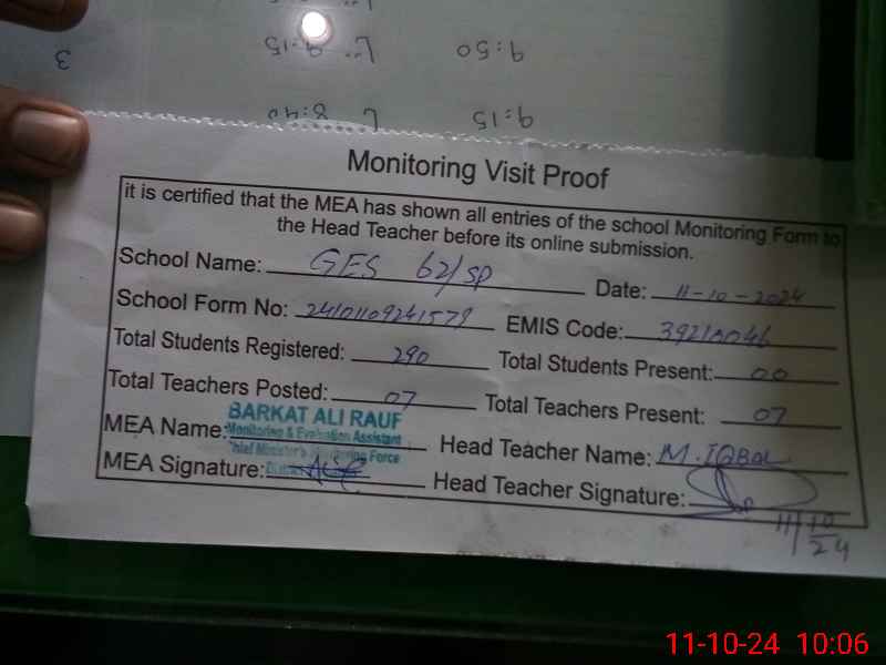 | Certified that this School was Inspected by the Undersigned MEA/DMO Today and the Information Stated Above is as Per Record. | |||||