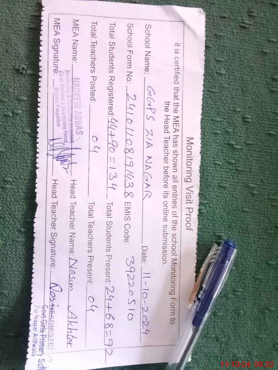 | Attendance Register | Head Teacher | MEA with School | Visit Proof |