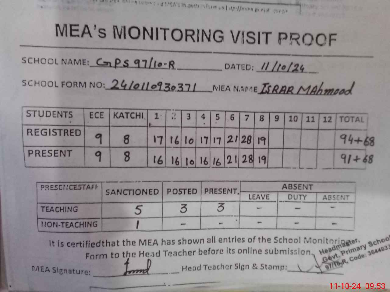 | Attendance Register | Head Teacher | MEA with School | Visit Proof |