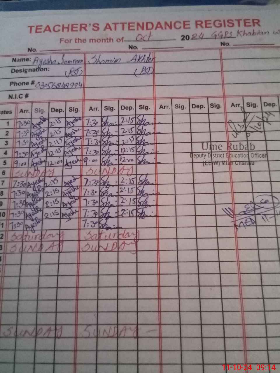 | Name: Ay**** Sa**** Designation: (School Headmaster's/Headmistress's) PST/PTC/JV Phone/Cell Number: 03**** |