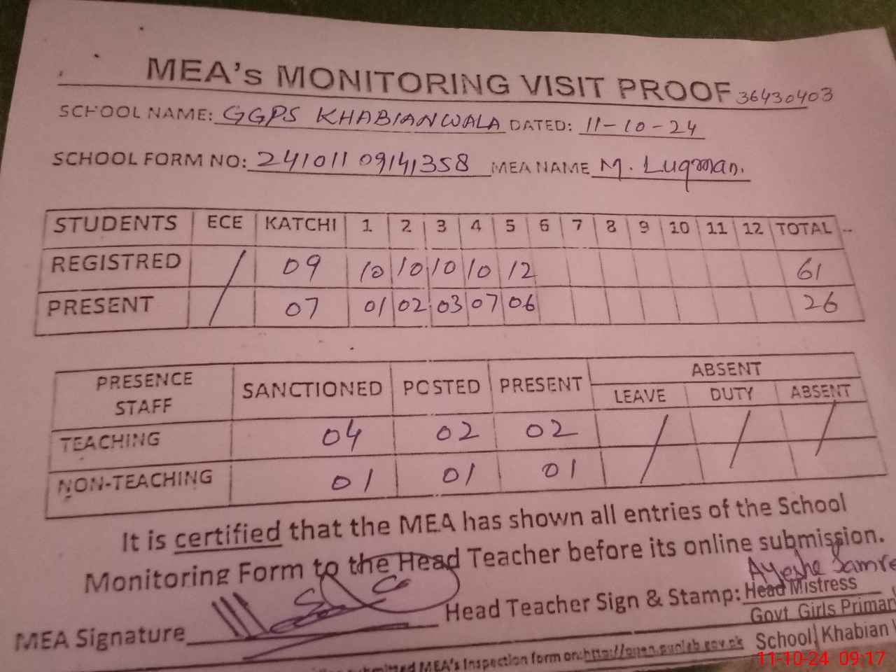 | Attendance Register | Head Teacher | MEA with School | Visit Proof |