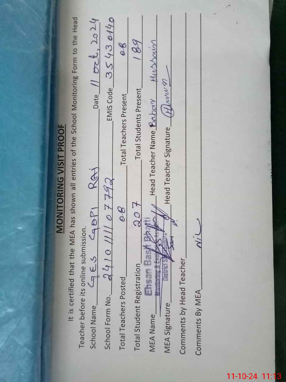 | Certified that this School was Inspected by the Undersigned MEA/DMO Today and the Information Stated Above is as Per Record. | |||||