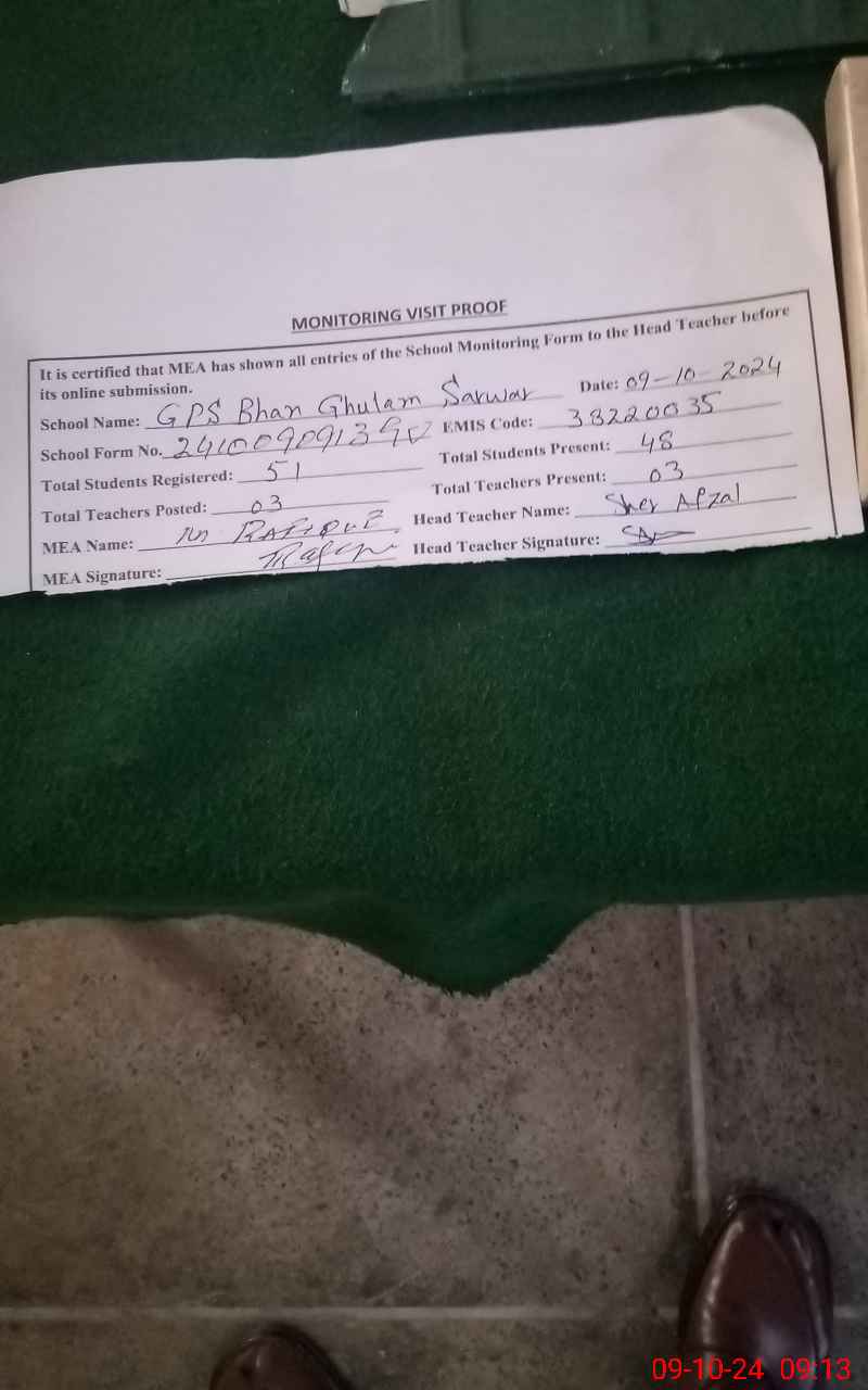 | EMIS Code: 38220035 | Name of School: GPS BHAN GHULAM SARWAR | |||