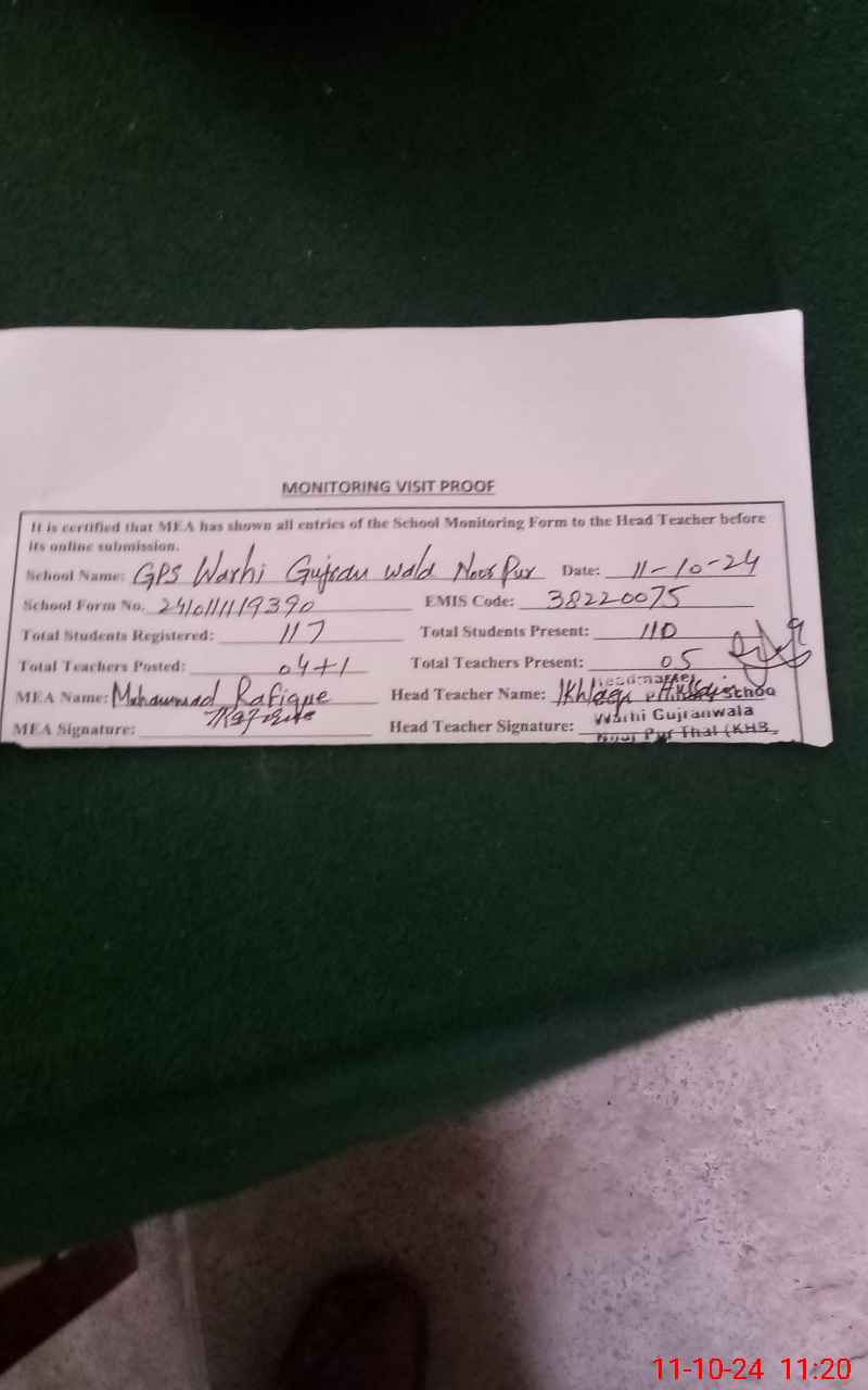| EMIS Code: 38220075 | Name of School: GPS WARHI GUJRAN WALA | |||