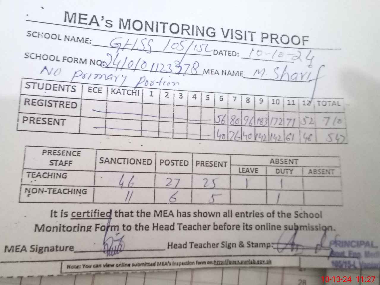 | Certified that this School was Inspected by the Undersigned MEA/DMO Today and the Information Stated Above is as Per Record. | |||||