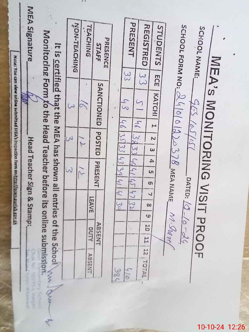 | Certified that this School was Inspected by the Undersigned MEA/DMO Today and the Information Stated Above is as Per Record. | |||||
