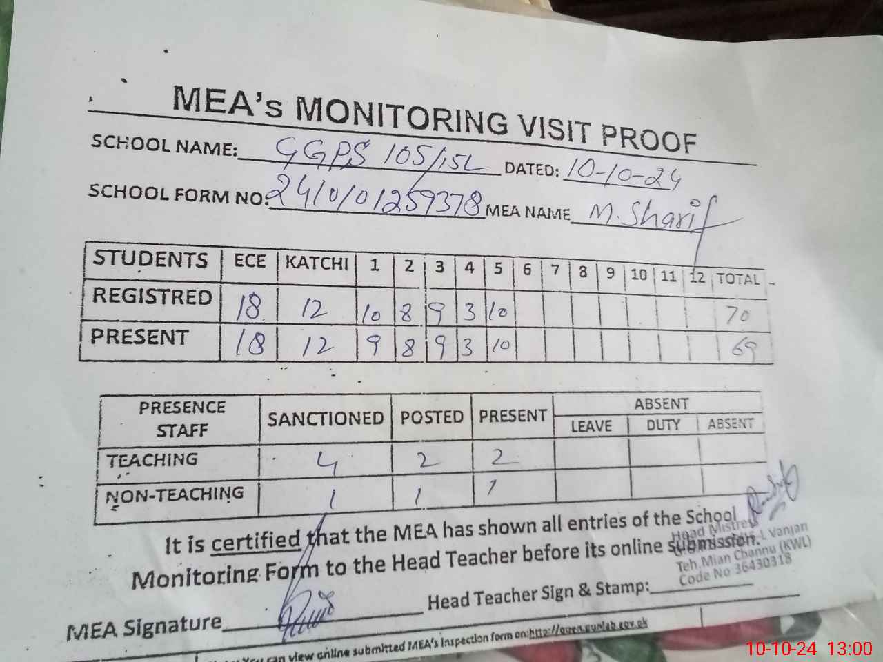 | EMIS Code: 36430318 | Name of School: GGPS 105/15-L, MIAN CHANNU | |||