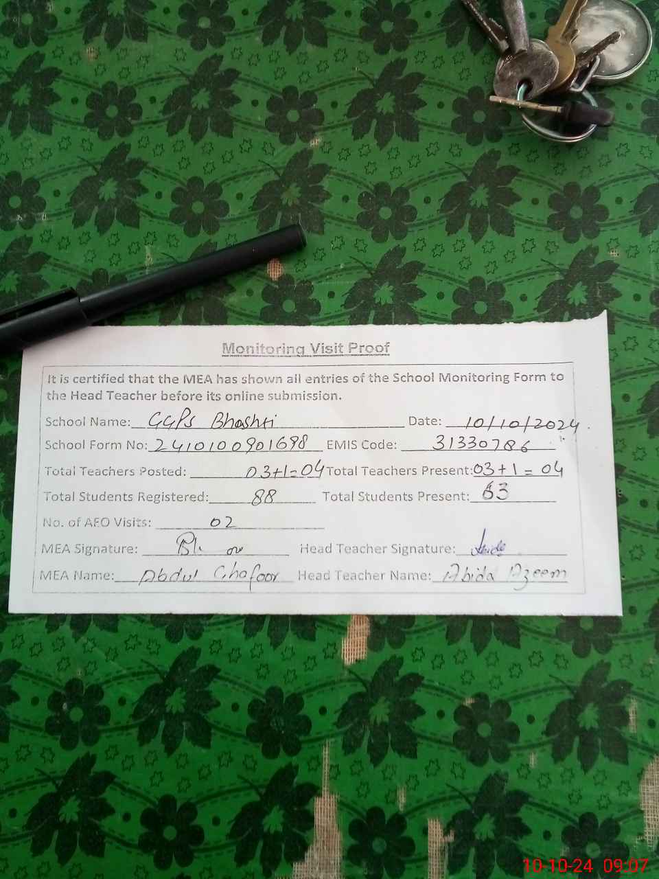 | Monitoring Date: 10-10-2024 | Start Time: 10-10-2024 08:31 AM | End Time: 10-10-2024 09:10 AM | Name of MEA: Ab**** Gh**** | |