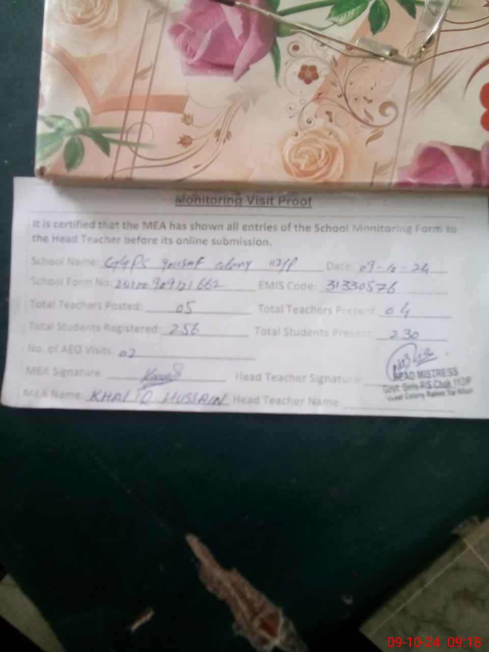 | Attendance Register | Head Teacher | MEA with School | Visit Proof |