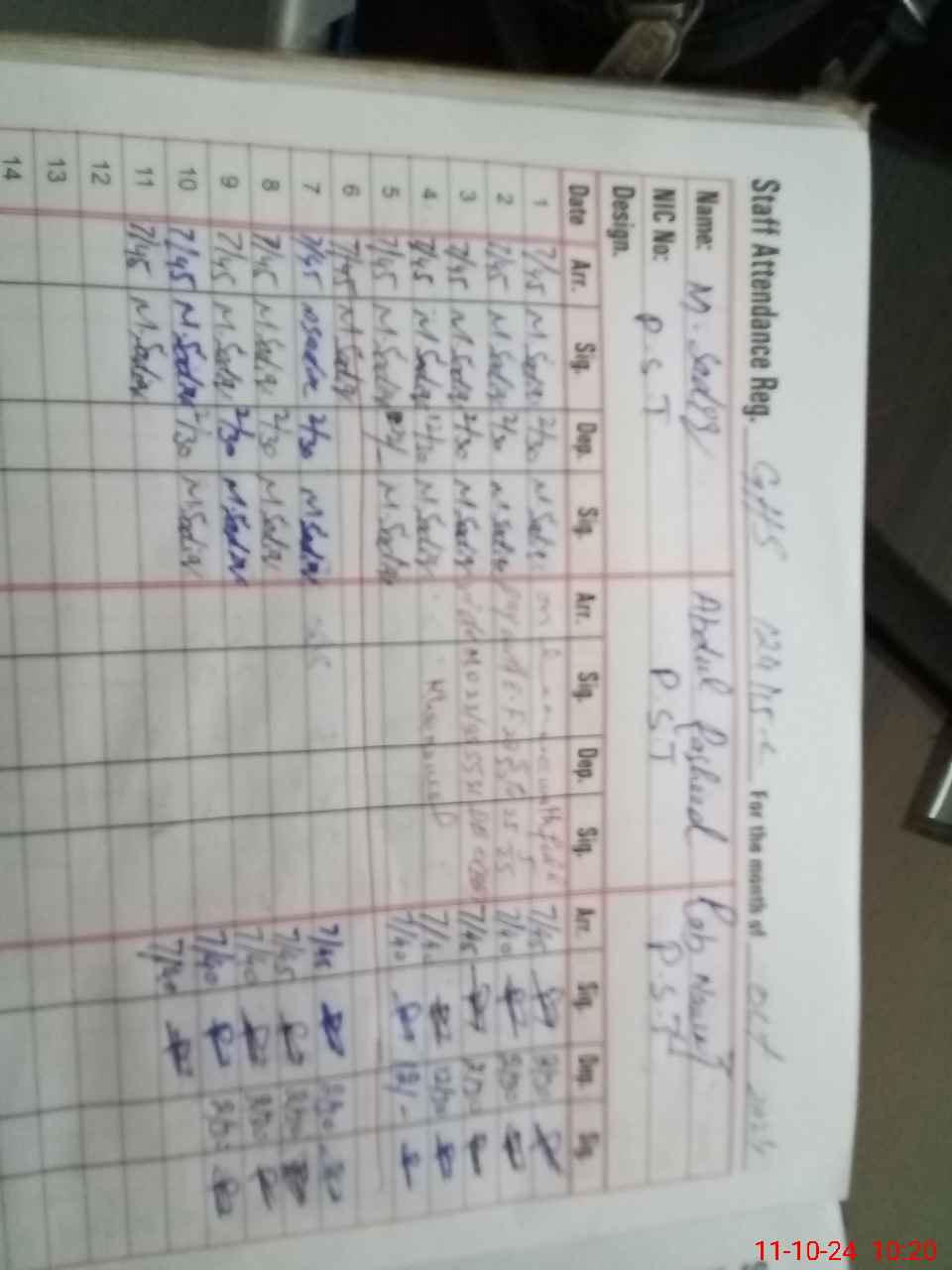 | CNIC | Full Name | Designation | R/C | Absence During Last Calender Month |