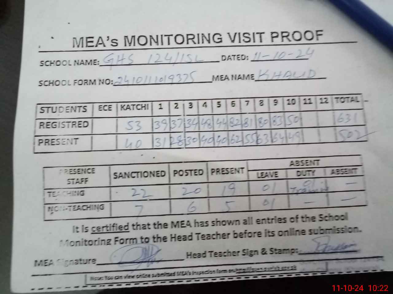 | Attendance Register | Head Teacher | MEA with School | Visit Proof |