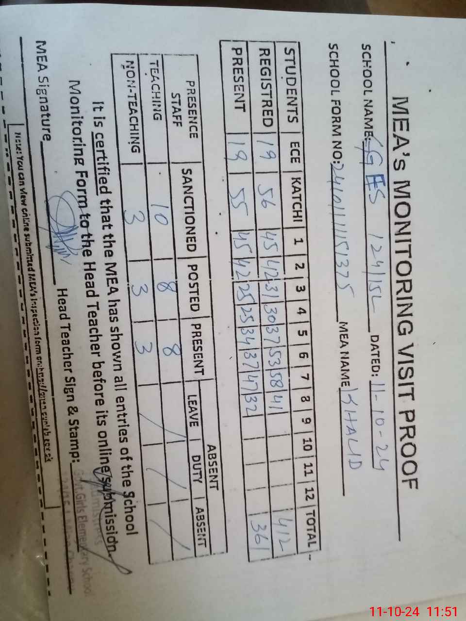 | Attendance Register | Head Teacher | MEA with School | Visit Proof |