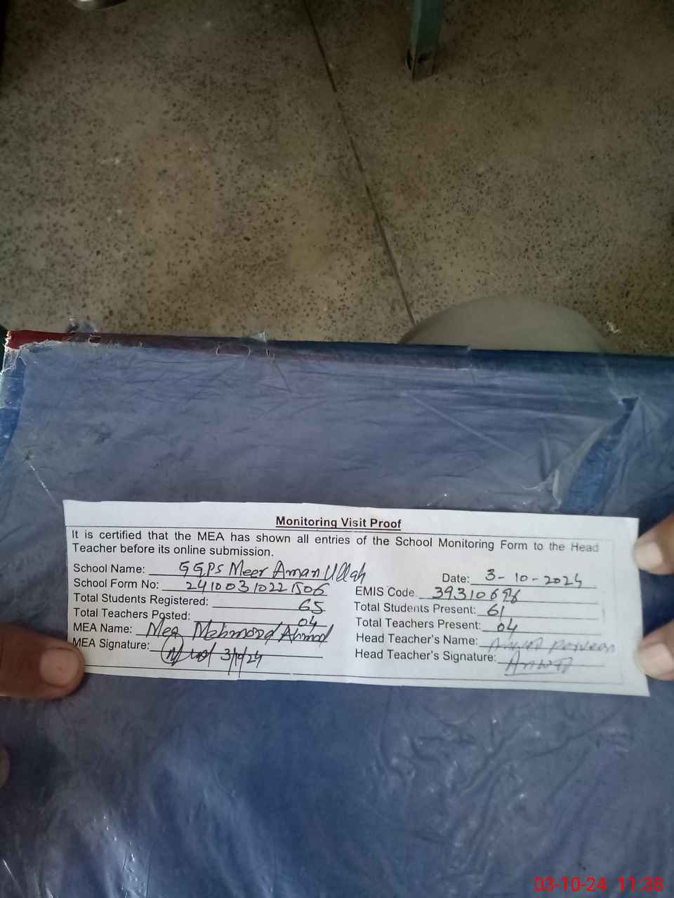 | Attendance Register | Head Teacher | MEA with School | Visit Proof |
