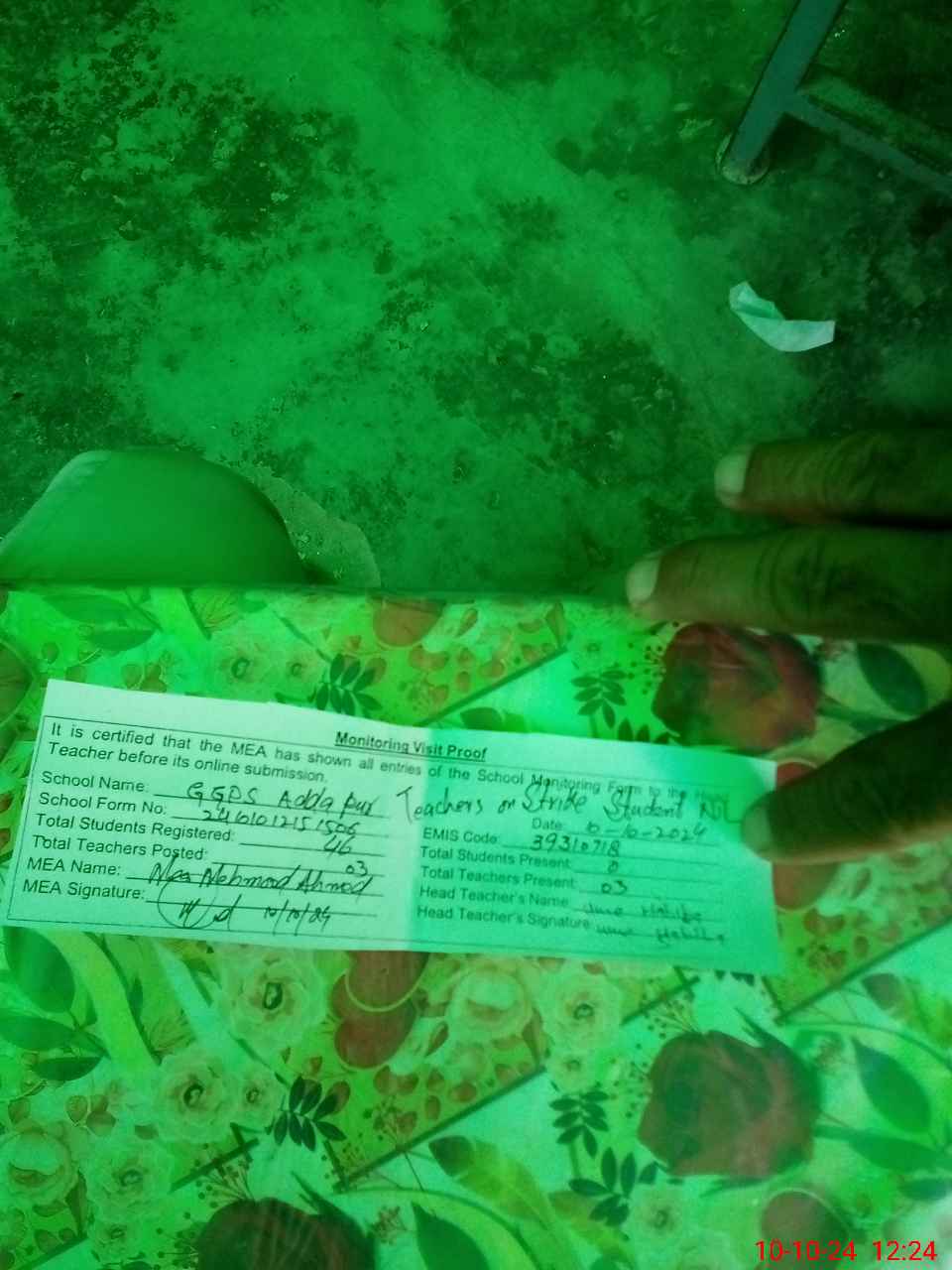 | Monitoring Date: 10-10-2024 | Start Time: 10-10-2024 12:15 PM | End Time: 10-10-2024 12:24 PM | Name of MEA: ME**** AH**** | |