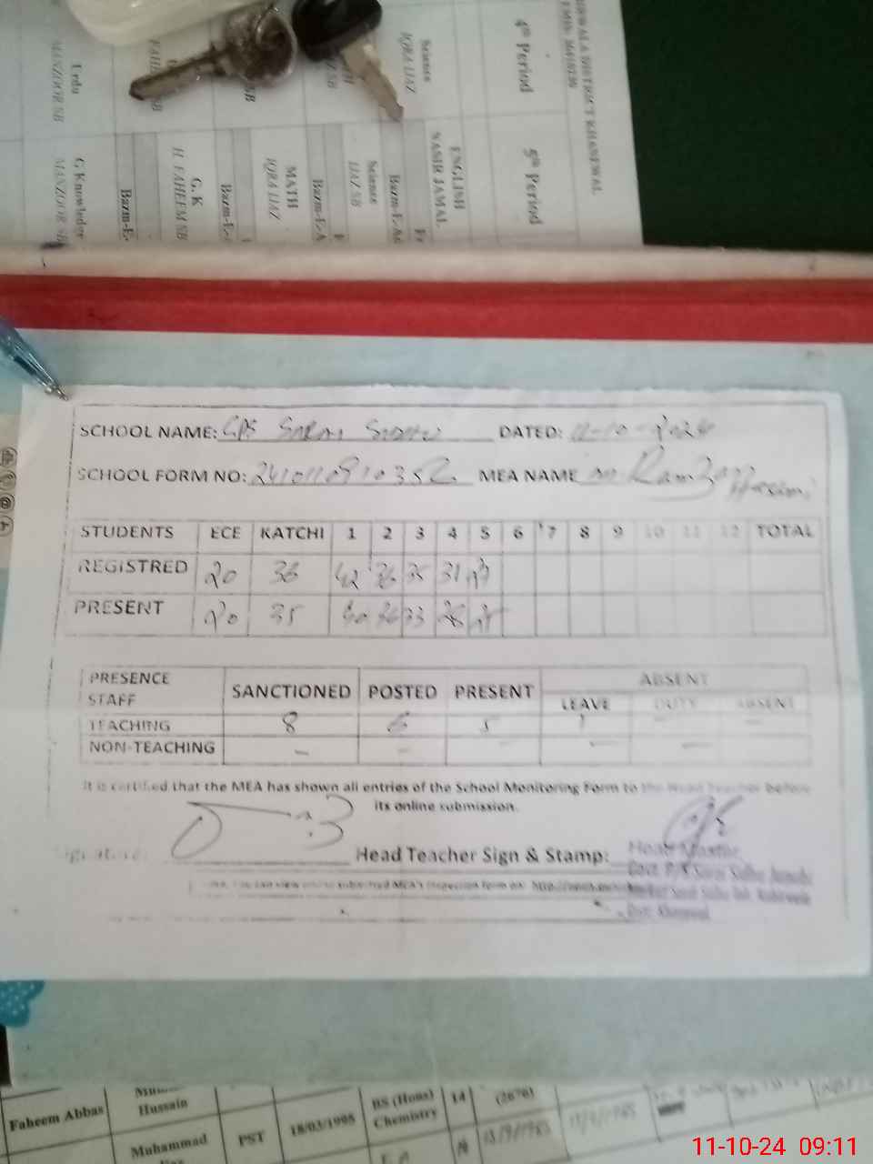 | Attendance Register | Head Teacher | MEA with School | Visit Proof |