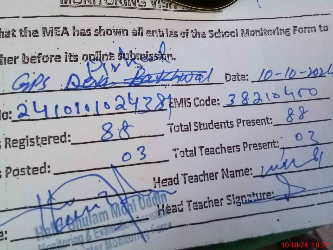 | Certified that this School was Inspected by the Undersigned MEA/DMO Today and the Information Stated Above is as Per Record. | |||||