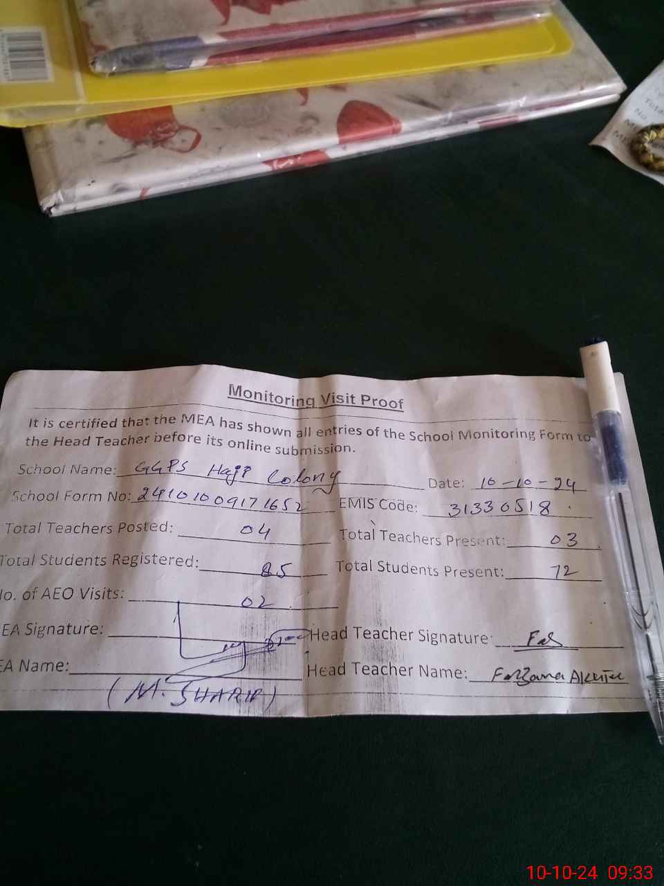 | Attendance Register | Head Teacher | MEA with School | Visit Proof |