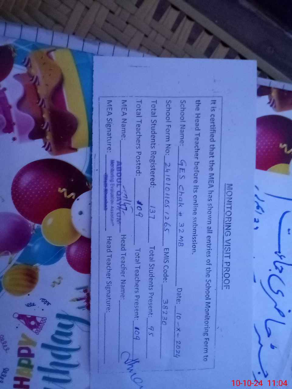 | EMIS Code: 38230836 | Name of School: GES CHAK NO. 32 MB | |||
