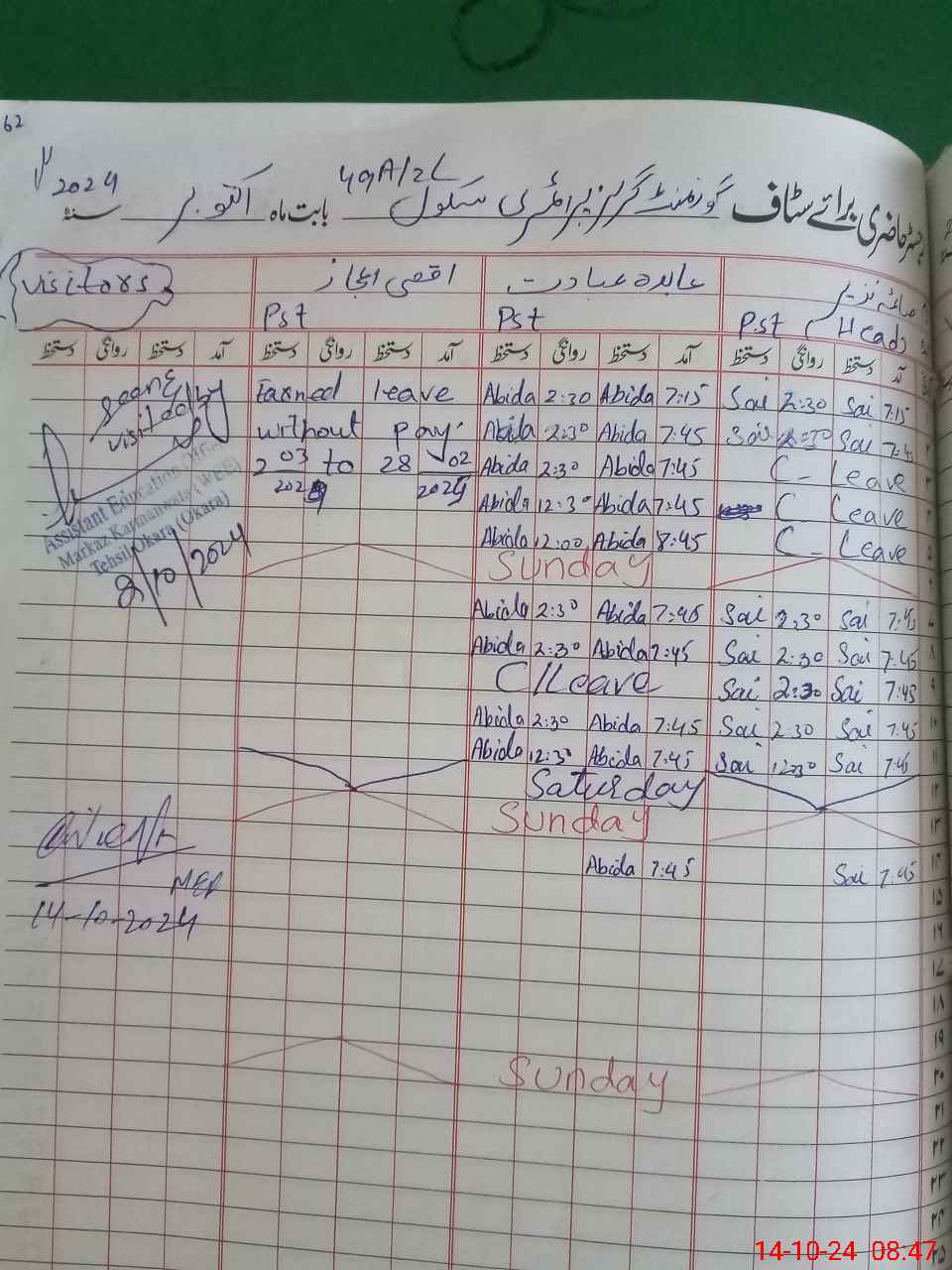 | Leave | Duty | Absent | Maternity | Medical | Ex- Pak |