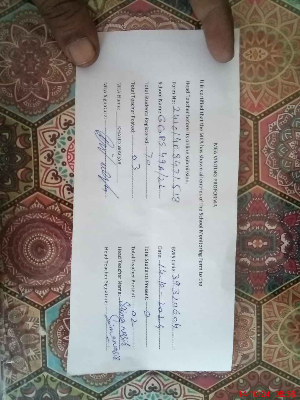 | Attendance Register | Head Teacher | MEA with School | Visit Proof |