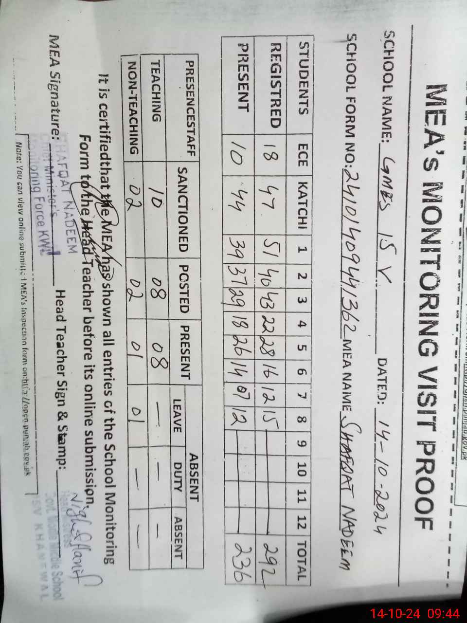 | Certified that this School was Inspected by the Undersigned MEA/DMO Today and the Information Stated Above is as Per Record. | |||||