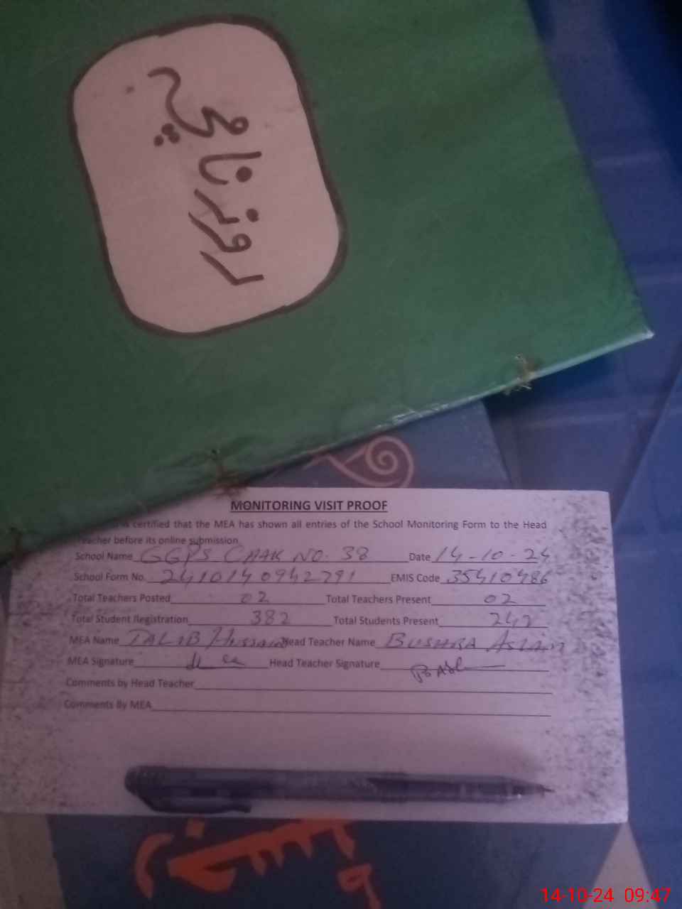 | Attendance Register | Head Teacher | MEA with School | Visit Proof |