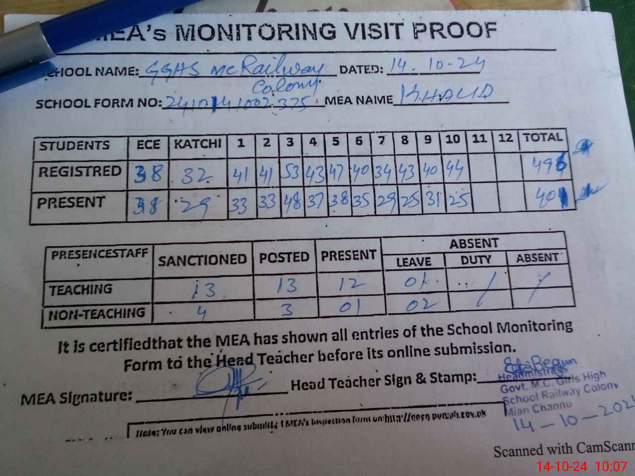 | Attendance Register | Head Teacher | MEA with School | Visit Proof |