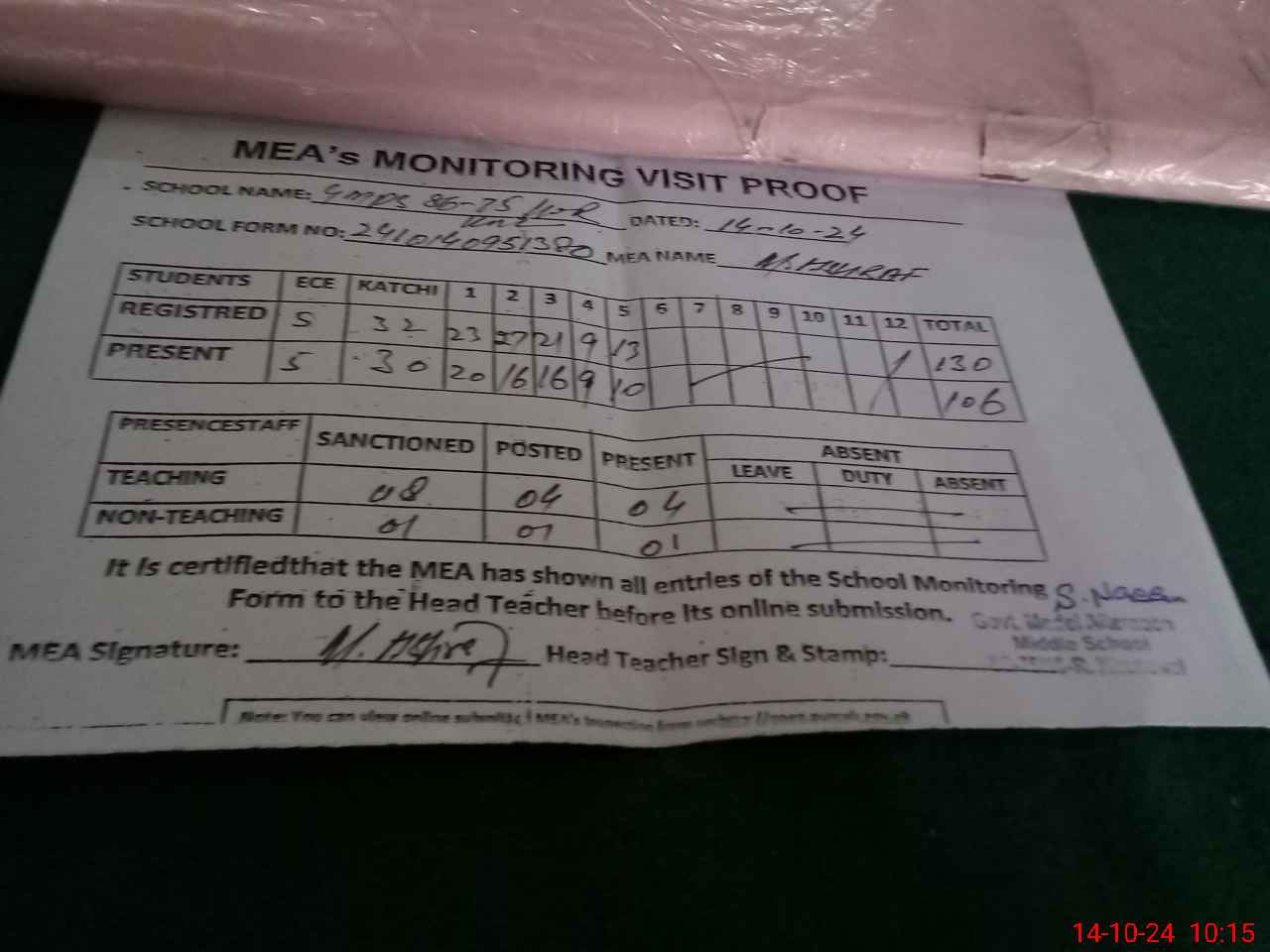 | Attendance Register | Head Teacher | MEA with School | Visit Proof |