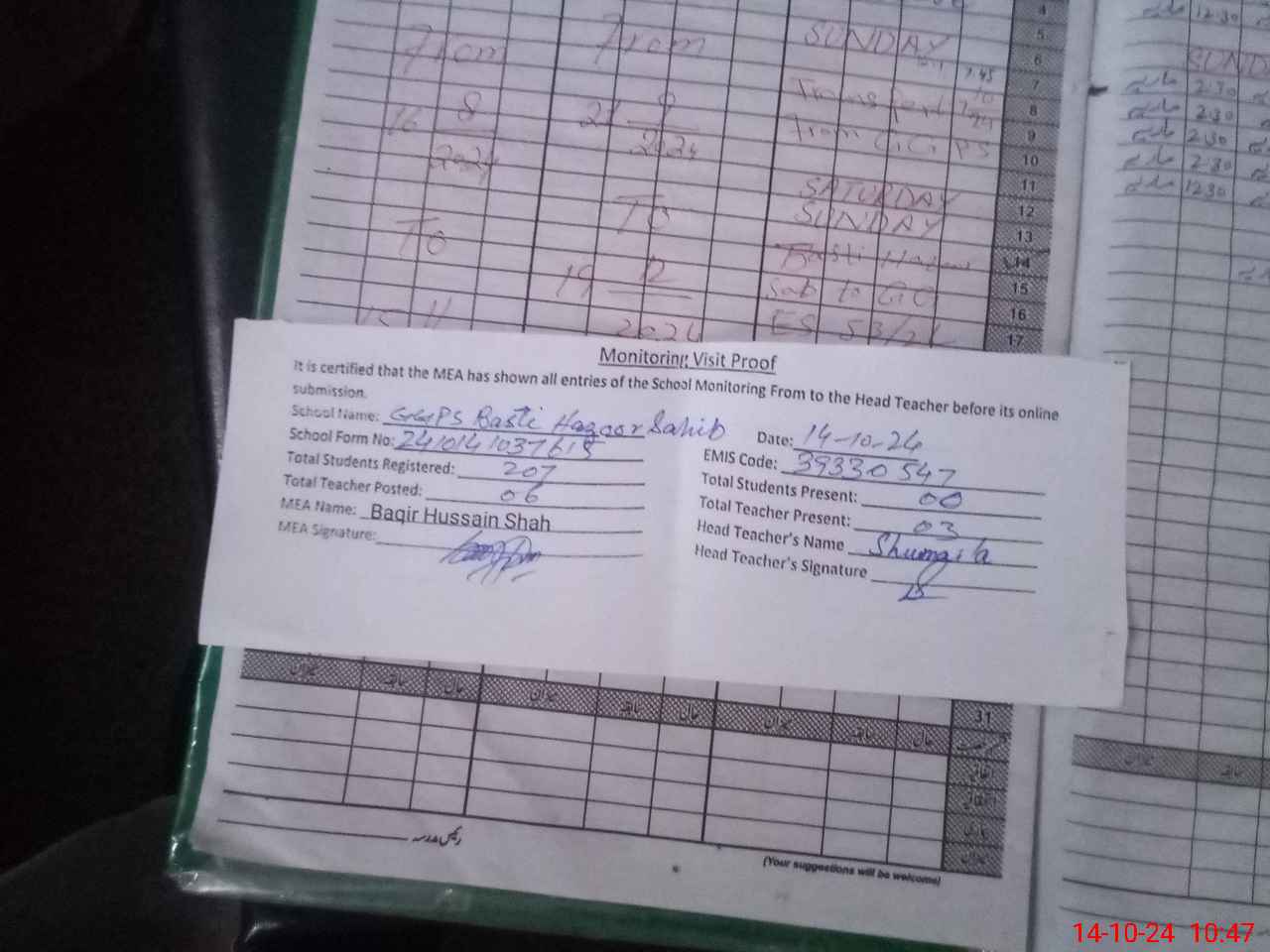 | Attendance Register | Head Teacher | MEA with School | Visit Proof |
