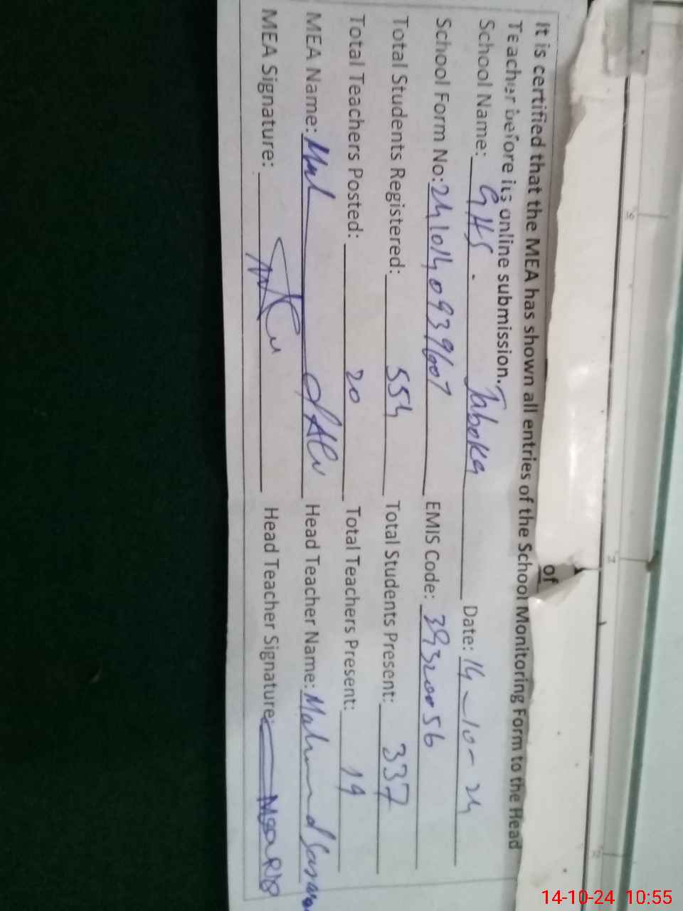 | Certified that this School was Inspected by the Undersigned MEA/DMO Today and the Information Stated Above is as Per Record. | |||||