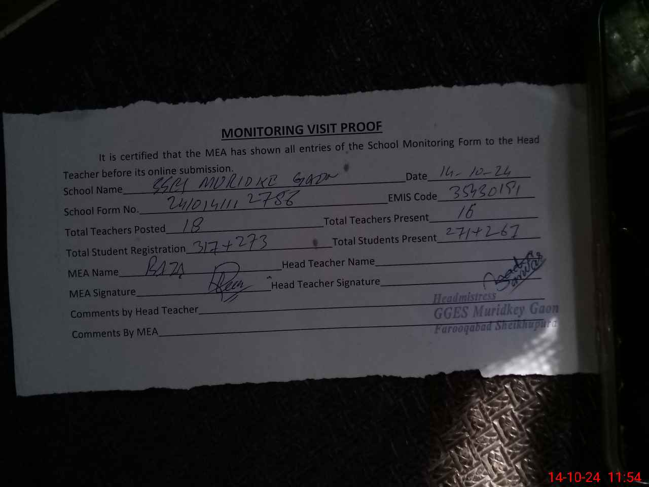 | Attendance Register | Head Teacher | MEA with School | Visit Proof |