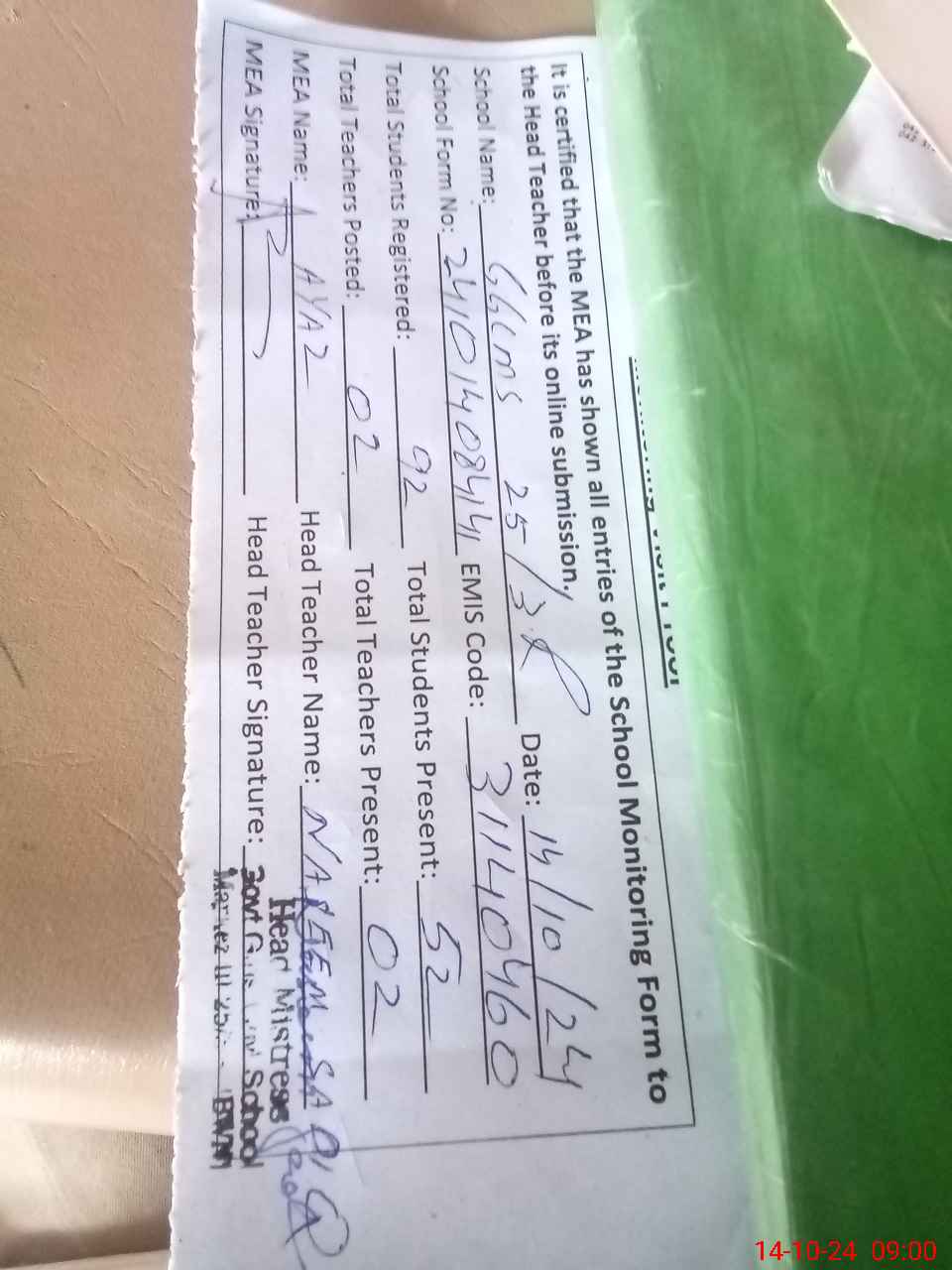 | Certified that this School was Inspected by the Undersigned MEA/DMO Today and the Information Stated Above is as Per Record. | |||||
