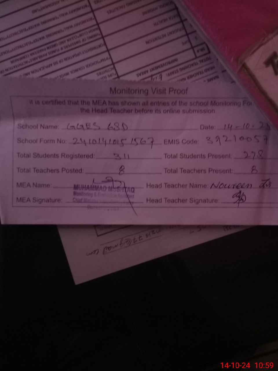| Certified that this School was Inspected by the Undersigned MEA/DMO Today and the Information Stated Above is as Per Record. | |||||
