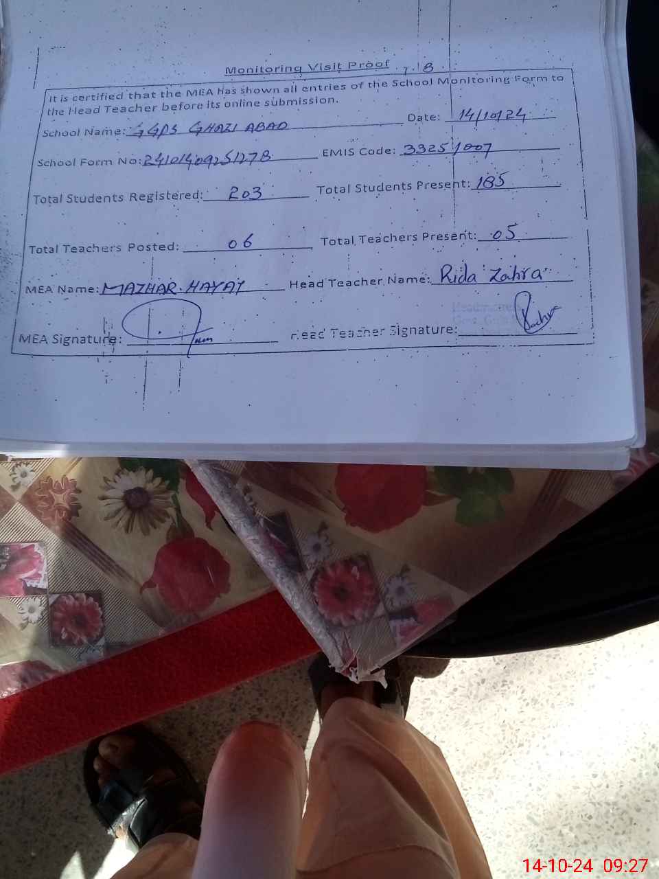 | Attendance Register | Head Teacher | MEA with School | Visit Proof |