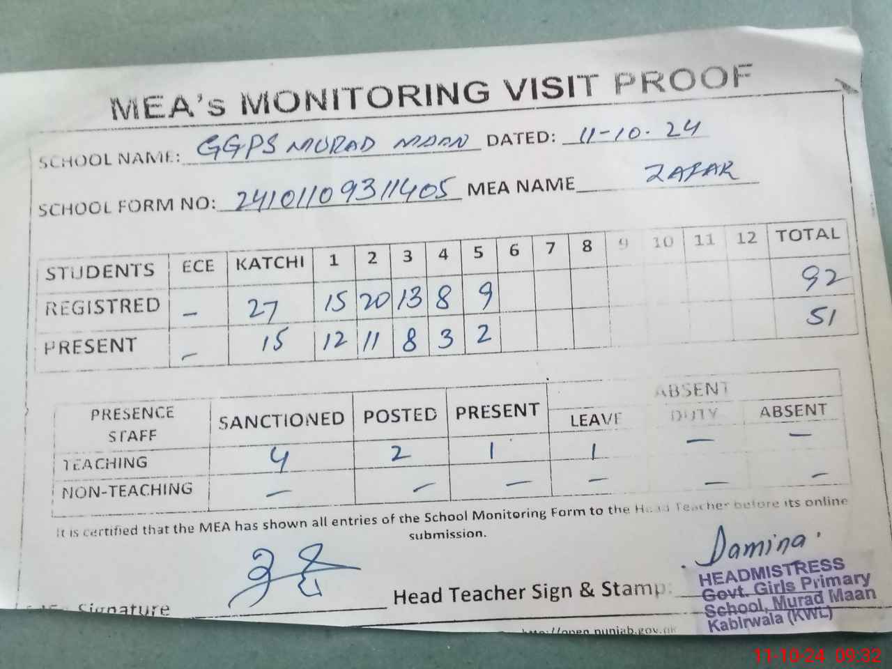 | Attendance Register | Head Teacher | MEA with School | Visit Proof |