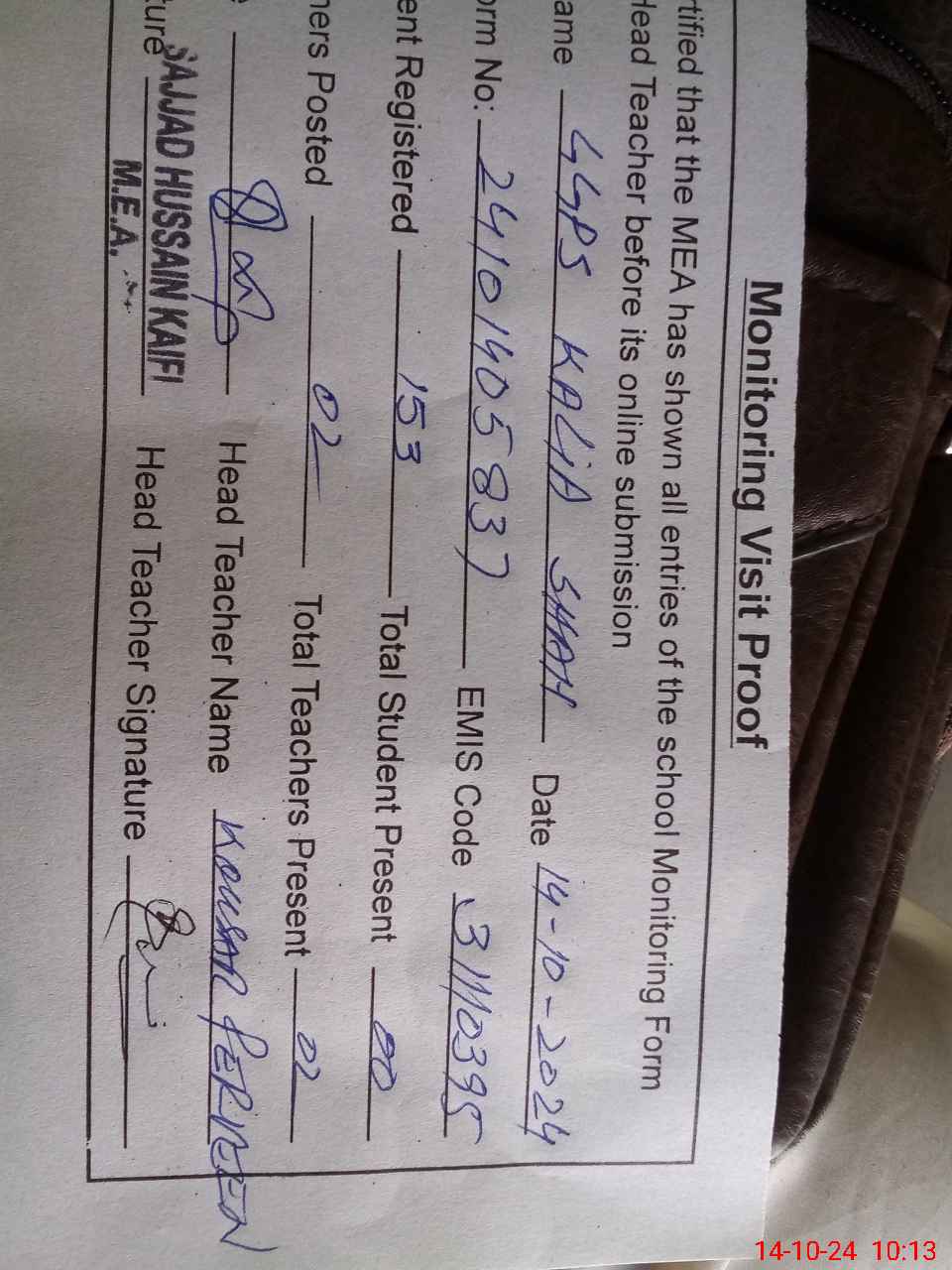 | Attendance Register | Head Teacher | MEA with School | Visit Proof |