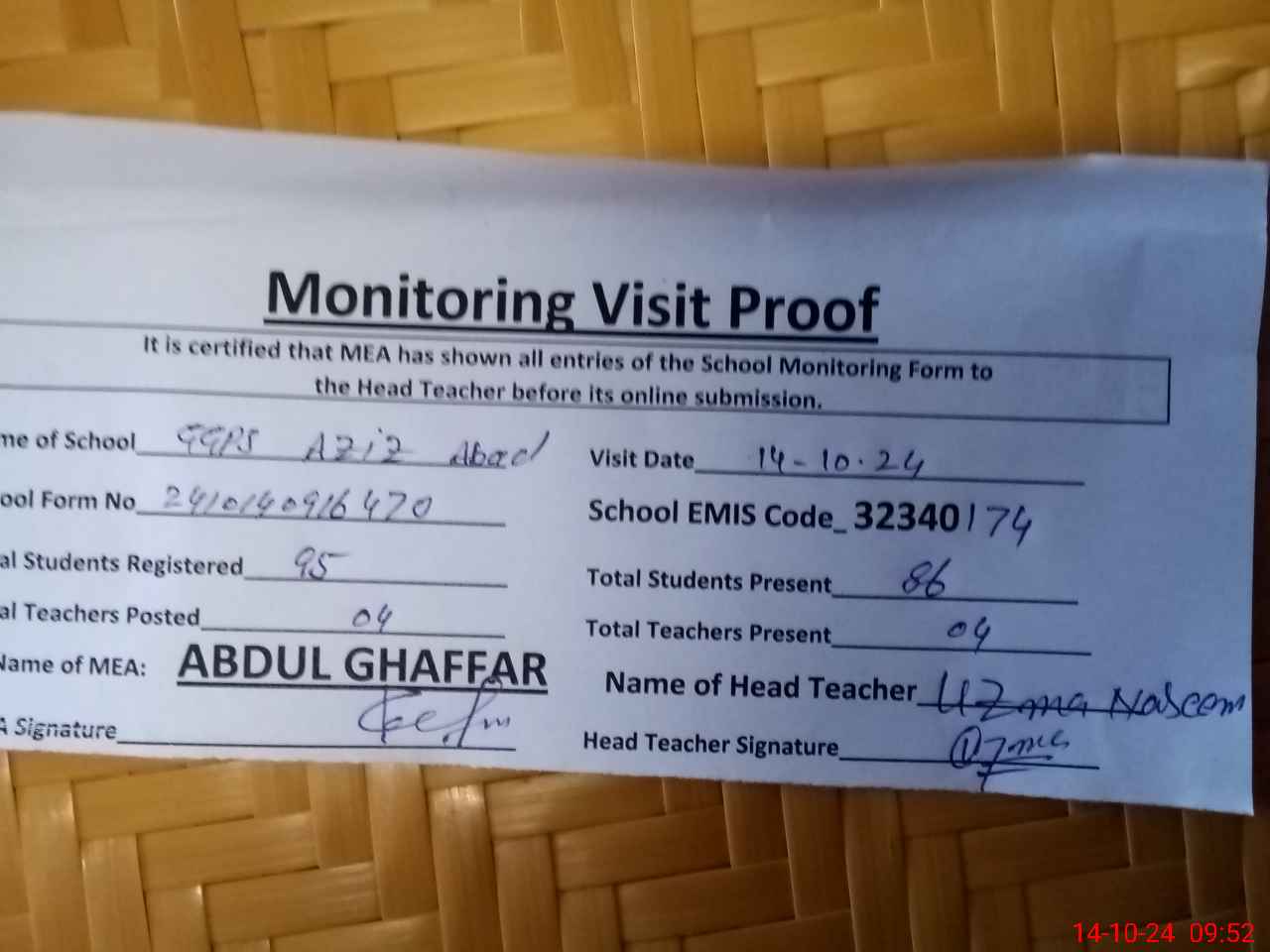 | EMIS Code: 32340174 | Name of School: GGPS AZIZ ABAD | |||