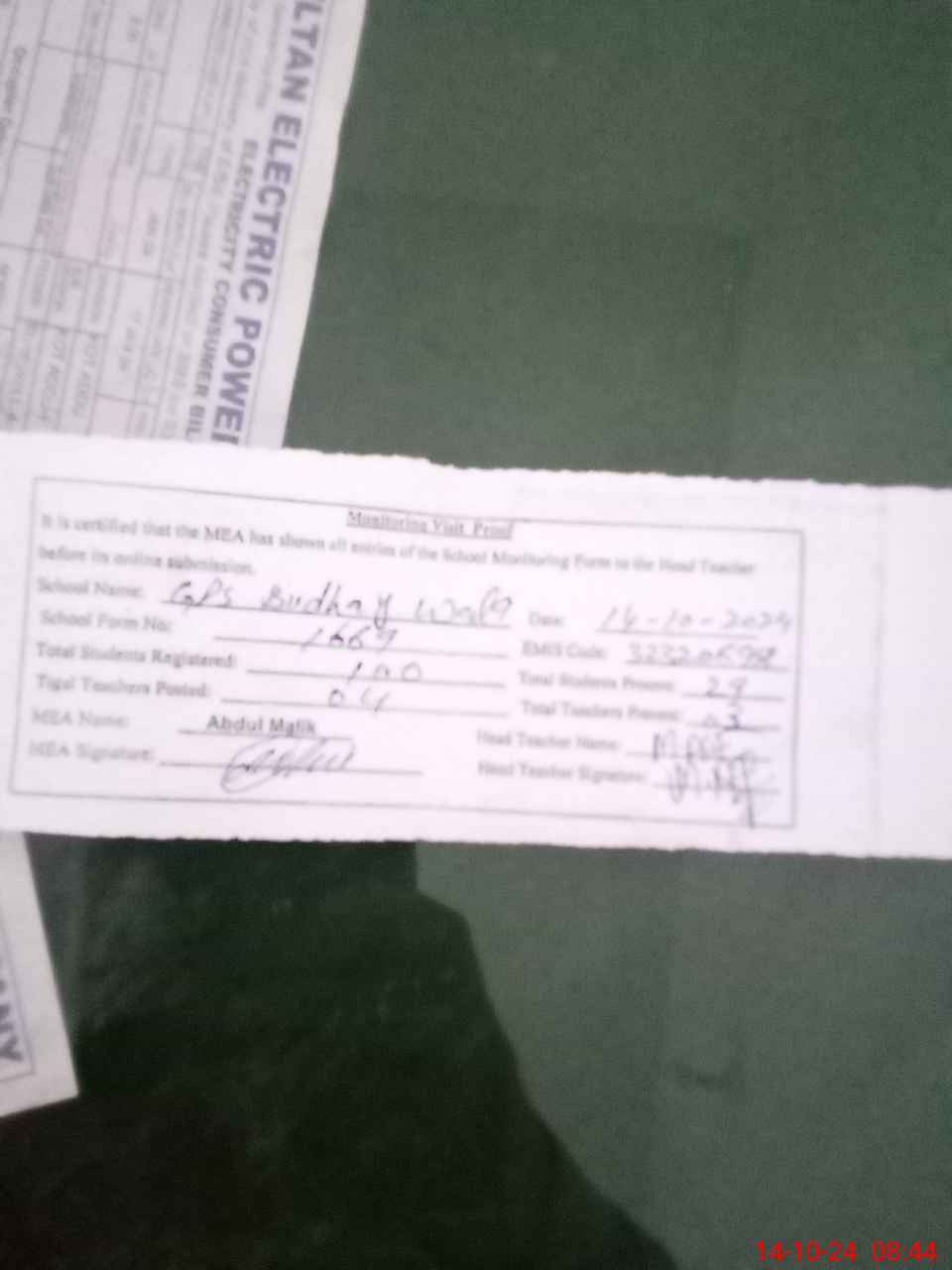 | Certified that this School was Inspected by the Undersigned MEA/DMO Today and the Information Stated Above is as Per Record. | |||||