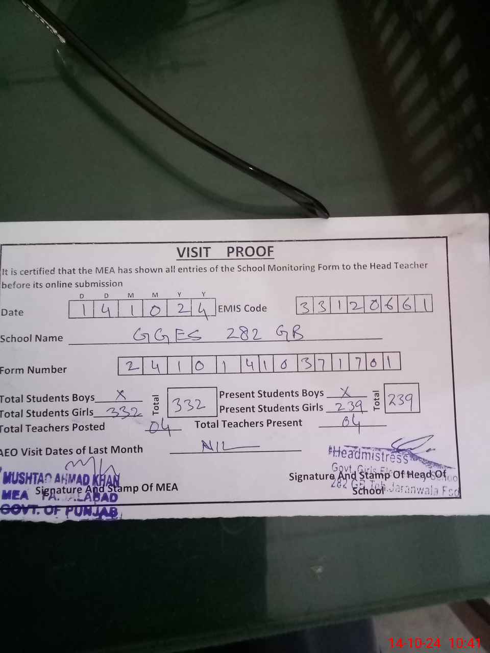 | Certified that this School was Inspected by the Undersigned MEA/DMO Today and the Information Stated Above is as Per Record. | |||||