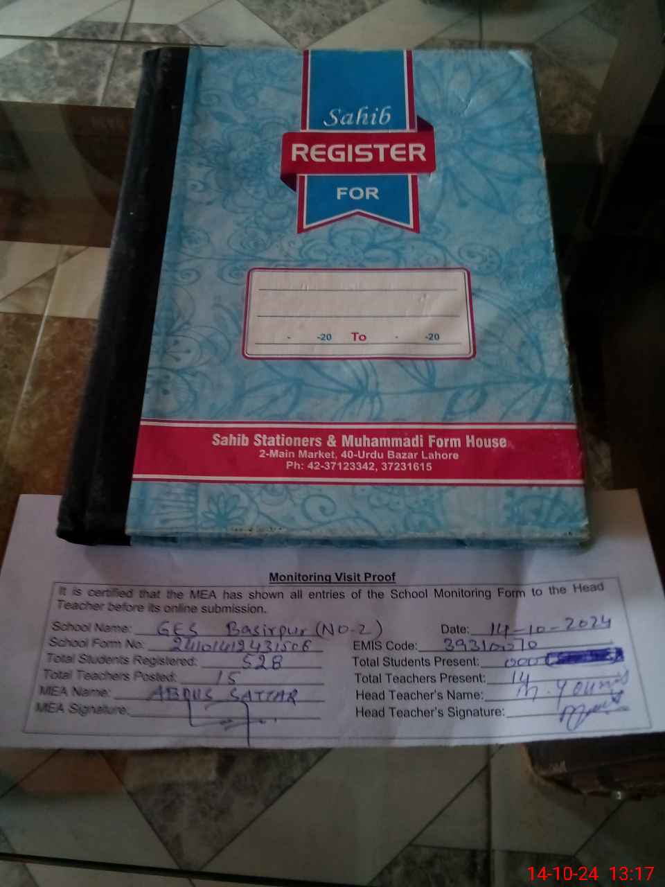 | Attendance Register | Head Teacher | MEA with School | Visit Proof |
