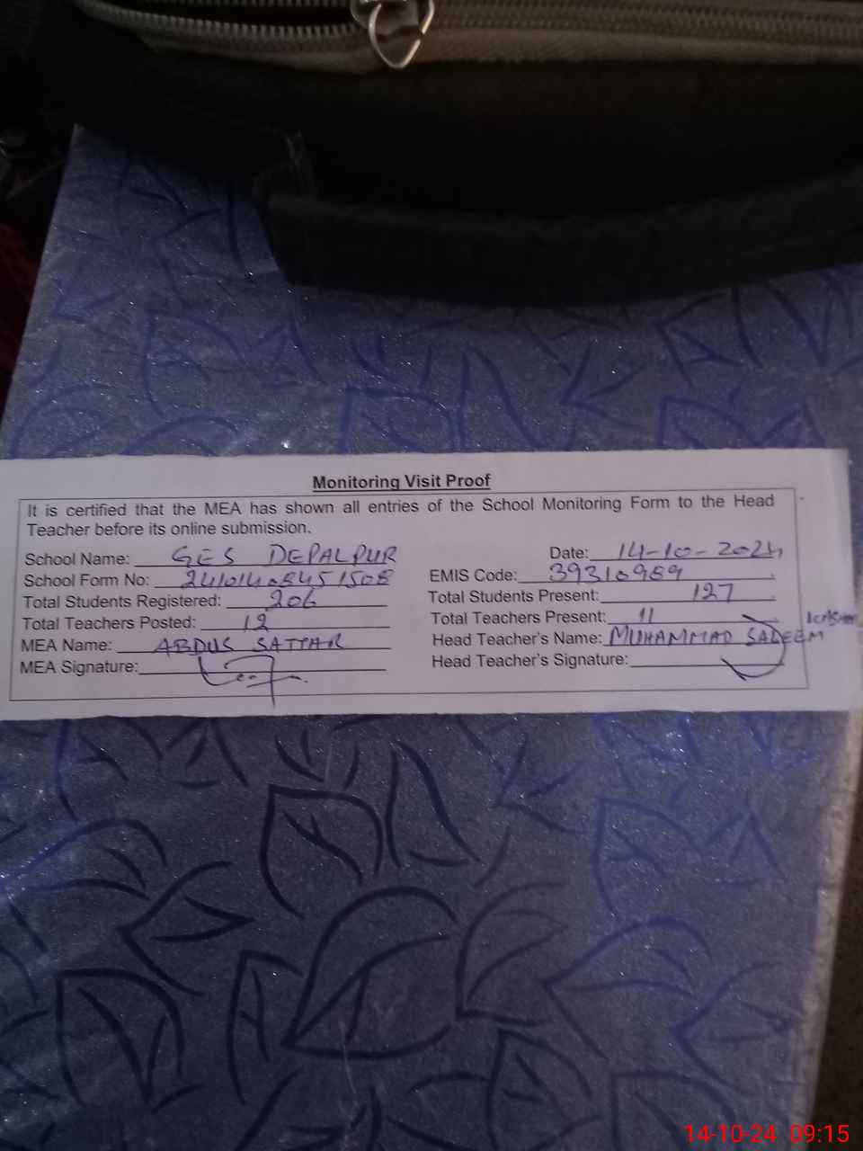 | Attendance Register | Head Teacher | MEA with School | Visit Proof |