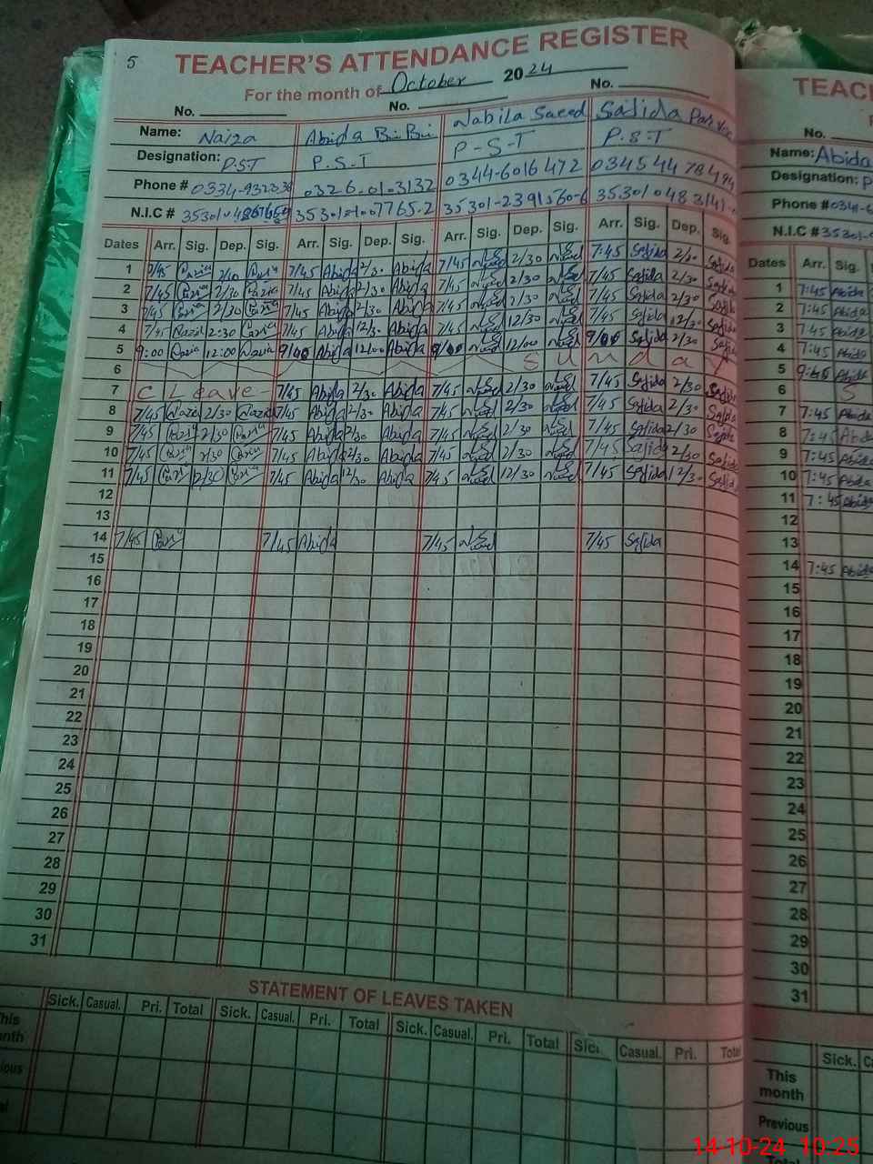 | CNIC | Full Name | Designation | R/C | Absence During Last Calender Month |